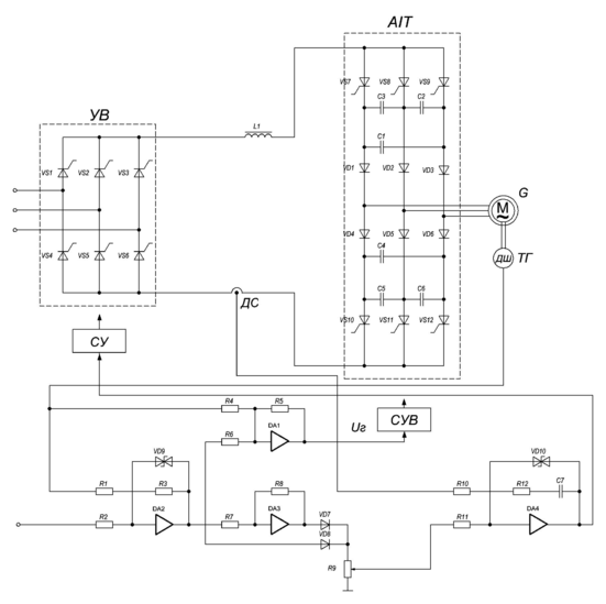 Аналогічно при подачі стрибком задаючої напруги UЗ з відкривається стабілітрон VD9, і в перший момент напруга Uβ = Uβma ma оскільки ω0 = 0. Із збільшенням кутової швидкості відбувається частотний пуск двигуна при постійному ковзанні і відповідних йому постійних струмі статора і моменті двигуна. Після закінчення пуску напруга Uω, що поступає з боку датчика кутової швидкості, стає близьким до задаючого UЗ. Стабілітрон VD9 закривається, і кутова швидкість приводу встановлюється відповідно до задаючого сигналу.