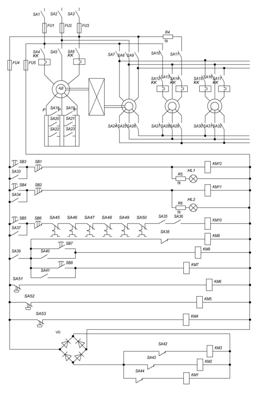 Для пуску двигуна включається автоматичний вимикач SA1, натискується кнопка SB2 "Пуск", внаслідок чого включаються контактори К1 і К2. На електроди тиристорів VS1, що управляють... VS4 подаються імпульси, зрушені на 60۫ відносно живлячої напруги. До статора двигуна прикладається знижена напруга, що призводить до зниження пускового струму і пускового моменту.