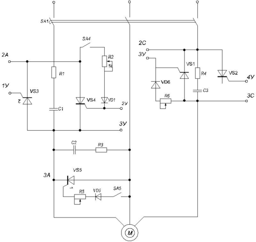 Використовуючи тиристори як силові комутатори, можна на статор при пуску подавати напругу від нуля до номінального значення, обмежувати струми і моменти двигуна, здійснювати ефективне гальмування або кроковий режим роботи. Така схема приведена на рис.1.4
