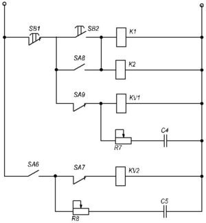 Розмикаючий контакт КМ1 відключає реле KV1 з витримкою часу, яка визначається резистором R7 і конденсатором С4. Розмикаючими контактами реле KV1 шунтуються відповідні резистори в блоці управління, і на статор подається повна напруга мережі.