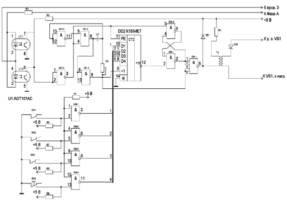 Синусоїдальна фазна напруга через резистор R1 поступає до вузла синхронізації, виконаному на здвоєному оптроні U1. При позитивній півхвилі струм протікає через світлодіод оптрона U1.1 і транзистор цього оптрона відкритий, тому на входах логічного елементу DD1.1 низький рівень сигналу. При негативній півхвилі відкритий транзистор оптрона U1.2 і на входах елементу DD1.1 також низький рівень.