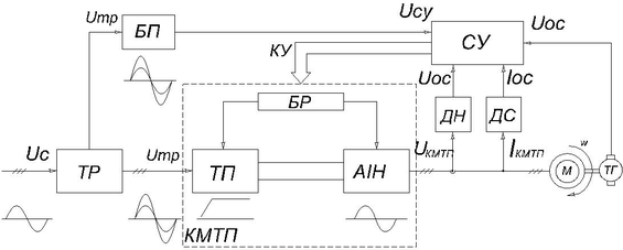 Трьохфазна сітьова напруга Uc поступає на трансформатор (ТР) і зменшується до необхідного рівня. Отримана на виході Uтр подається на керований мостовий тиристорний перетворювач (КМТП) який складеться з тиристорного перетворювача (ТП) та автономного інвертора напруги (АІН). Як видно з функціональної схеми рис.2.2 тиристорний перетворювач ТП перетворює трьохвазну синусоїдальну напругу в однофазну постійну. Uтп, яка потім подається до АІН, такий комплекс КМТП дозволяє реалізувати частотне управління виконавчим приводом стрічкового конвеєра. Закони управління КМТП реалізуються за допомогою системи управління (СУ). Вироблені імпульси управління передаються по каналу управління (КУ) до блоку регулювання (БР). Рівень управляючих імпульсів залежить від використаних в системі зворотніх зв’язків які реалізовані на датчиках струму (ДС) та датчиках напруги (ДН) які реалізують зворотній зв'язок по струму та напрузі.