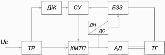 Для забезпечення нормальної роботи системи управління, що розробляється, складемо структурну схему всього комплексу, яка представлена на рис.2.1 Напруга мережі поступає на трансформатор (ТР), де зменшується до необхідного рівня живлення керованого мостового перетворювача тиристора (КМПТ). Унаслідок чого забезпечується обертання асинхронного двигуна (АД), на вал якого закріплений за допомогою механічного зв'язку тахогенератор (ТГ) промовець у вигляді елементу зворотного зв'язку за швидкістю. Отримані сигнали зворотного зв'язку за швидкістю, струму і напрузі через блок зворотних зв'язків (БЗЗ) подається в систему управління (СУ) що дозволяє регулювати роботу КМПТ. Система управління насичується від додаткового джерела живлення (ДЖ).