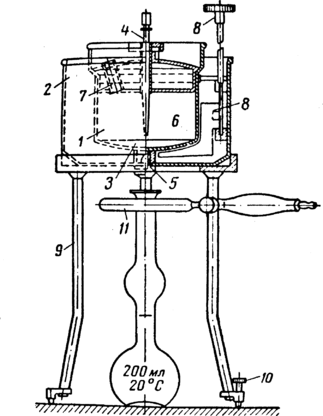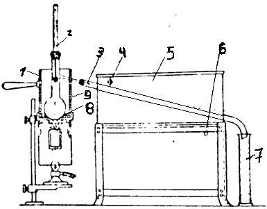 I - колба; 2 - термометр; 3 - трубка холодильника; 4-, 6 - патрубки для ввода и вывода воды; 5 - ванна холодильника; 7- мерный цилиндр; 8 - асбестовая прокладка; 9 - кожух.