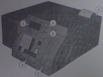 1-индикатор включения в сеть, 2-индикатор включения рентгеновской трубки, 3-дисплей, 4-клавиатура, 5-пробозагрузочное устройство, 6-встроенный принтер.