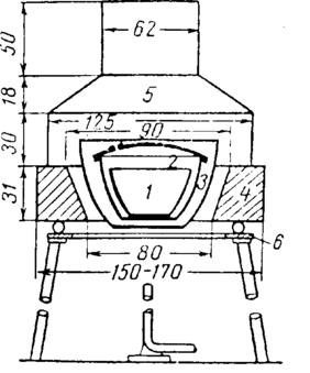 1-фарфоровой тигель емкостью около 30 мл (низкий, широкий) для исследуемого топлива; 2-железный тигель с крышкой, имеющей отверстие для выхода паров нефтепродукта; 3-железный тигель с крышкой; 4-железный муфель с прорезом для вставки тиглей; 5-железный колпак с трубкой; 6-фарфоровый треугольник