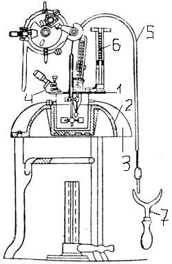 1-сосуд; 2-баня; 3-рубашка; 4-зажигательное приспособление;5-мешалка; 6-пружинный рычаг; 7-держатель
