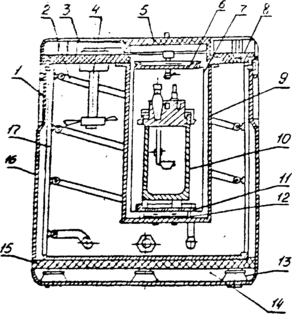 Через фторопластовую втулку 5 ось мешалки выходит за пределы калориметрического сосуда. На верхней крышке сосуда расположены два ушка б для извлечения его из гнезда и переноски посредством ручки, а также два отверстия для установки термометров сопротивления.