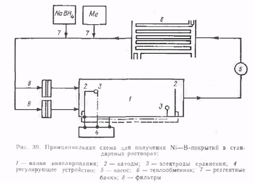 Специальная схема включает электроды сравнения 3, изготовленные в виде тонких никелевых стержней, и регулирующее устройство 4, поддерживая на ванне постоянное значение (~0,6 В) «защитного потенциала». Катоды и электроды должны иметь по возможности малую поверхность для предупреждения выпадения осадка. Система циркуляции и регенерации раствора включает в себя центробежный насос 5, теплообменник б для поддержания необходимой температуры, бачки 7 для пополнения раствора реагентами и фильтры 8, через которые откорректированный раствор вводится вновь в ванну. По аналогичной схеме работают установки барабанного типа.
