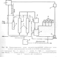 Установка имеет пульт управления и работает по автоматическому циклу. Что касается материалов, из которых сделаны отдельные узлы установки, то нагреватель 7 состоит из трубчатой греющей камеры и эмалированных съемных греющих труб. Отдельные части нагревателя, соприкасающиеся с раствором имеют лакокрасочное покрытие, состоящее из двух слоев клея БФ-2, пигментированного окисью хрома, и двух слоев эпоксидно-фенольного лака Точно так же защищены насос, приборы КИП и другие части. Аппаратура, которая соприкасается с ненагретым раствором, выполнена из винипласта, стали, футерованной полиэтиленом, коррозионно-стойкой стали без покрытий. Трубопроводы для нагретого раствора — полиэтиленовые, вентили футерованы полиэтиленом. Вода для обогрева труб нагревателя может дополнительно подогреваться паром, подаваемым в межтрубное пространство греющей камеры.