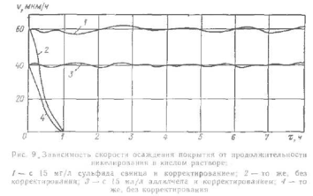 С течением времени скорость никелирования в некорректируемых кислых растворах постепенно уменьшается и через 6 ч работы процесс образования покрытий почти прекращается. При этом кислотность растворов возрастает, они мутнеют, на дно ванны выпадает нерастворимый осадок. Перегрев растворов и изменение оптимальной концентрации компонентов приводят к саморазряду и образованию никеля в объеме ванны. Практически установлено, что растворы с янтарнокислым натрием позволяют получать за то же время более толстый слой покрытия чем растворы с уксусно- или лимоннокислым натрием. Кроме того, чем больше плотность загрузки ванны, тем меньше скорость осаждения покрытия за равный промежуток времени.