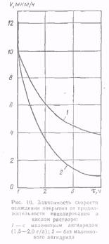 На рис. 7 показана зависимость скорости осаждения покрытия от продолжительности никелирования в растворе с малеиновым ангидридом и без него. Из рисунка видно, что в растворе следующего состава (г/л), сернокислый никель 21, гипофосфит натрия 24, уксуснокислый натрий 10, рН 5.0—5,2 и температура 82—84 °С. при плотности загрузки 1 дм2/л, содержащем 1.5—2 г/л малеинового ангидрида, скорость покрытия на четвертом часу работы ванны почти в четыре раза выше, чем без этого стабилизатора.