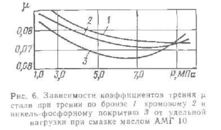 ис. 6 Зависимость коэффициента трения μ стали при трении по бронзе 1, хромовому 2 и никель-фосфорному покрытию 3 от удельной нагрузки при смазке маслом АМГ 10.