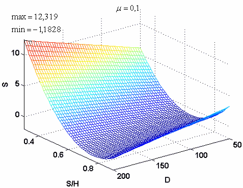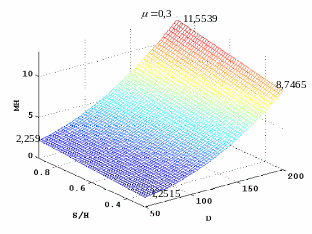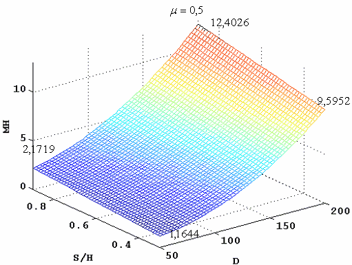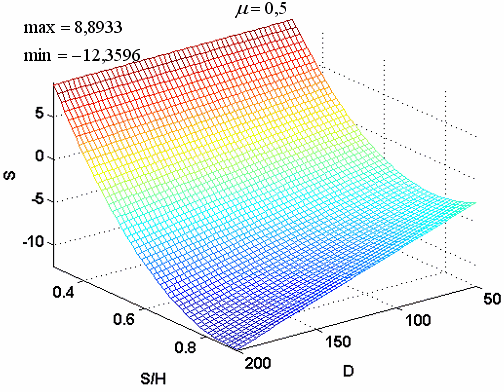 На рисунках 3.20 а,б,в – 3.21 а,б,в, показаны поверхности, определяющие усилие пресса и перемещение узлов внутренней поверхности кольца, в зависимости от диаметра кольца D и от отношения высоты к ширине кольца