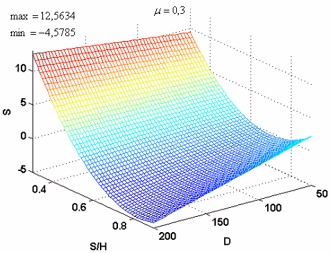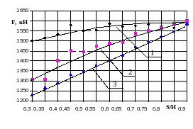 Рисунок 3.20 а. Зависимость усилия пресса от диаметра D заготовки и от отношения толщины к высоте S/H при