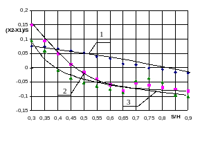 Рисунок 3.18б. Перемещение координат х1 и х2, при m=0,3; 1- диаметр D=50 мм, 2- диаметр D=100 мм, 3- диаметр D=200 мм.