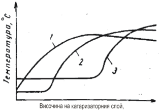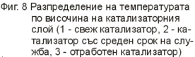 Газът постъпващ за нискотемпературна конверсия, независимо от състава на изходната суровина, съдържа не повече от 2,5% СО. Следо-вателно повишението на температурата не трябва да е повече от 25 0С, което е напълно допустимо, а прегряване е допустимо само при наруше-ние в режима на работа на предходния стадий. Характеристиката на изменение на температурата в катализаторния слой е свързана с разпре-делението по дължината на реакционната зона на реакцията на въглеродния оксид и зависи от активността на катализатора (фигура 8)