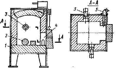 В камерной печи заготовки 2 укладывают на под 1 печи через окно 4 и после прогрева до заданной температуры извлекают через то же окно. Рабочее пространство печи нагревают сжиганием газа с помощью горелок 3, служащих для смешения газа с воздухом и подачи смеси в печь. Продукты сгорания отводят через дымоход 5 в рекуператор – теплообменник, в котором поступающий к горелкам воздух нагревается теплотой горячих уходящих газов. Подогрев воздуха до температуры 350-500