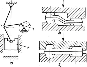 Кинематическая схема кривошипно-коленного пресса (а) и схемы плоскостной (б) и объемной (в) калибровок.