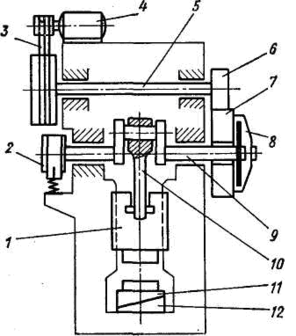 Электродвигатель 4 передает движение клиновыми ремнями на шкив 3, сидящий на приемном (промежуточном) валу 5, на другом конце которого закреплено малое зубчатое колесо 6. это колесо находится в зацеплении с большим зубчатым колесом 7, свободно вращающимся на кривошипном валу 9. С помощью пневматической фрикционной дисковой муфты 8 зубчатое колесо 7 может быть сцеплено с кривошипным валом 9; тогда последний придет во вращение. Посредством шатуна 10 вращение кривошипного вала преобразуется в возвратно-поступательное движение ползуна 1.