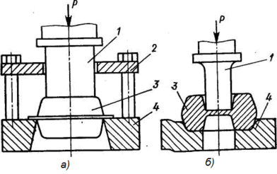 При пробивке пленки (рисунок б) поковку 3 укладывают в матрицу 4 и с помощью пуансона 1 пробивают; отход проваливается через отверстие матрицы в тару, установленную под столом пресса.