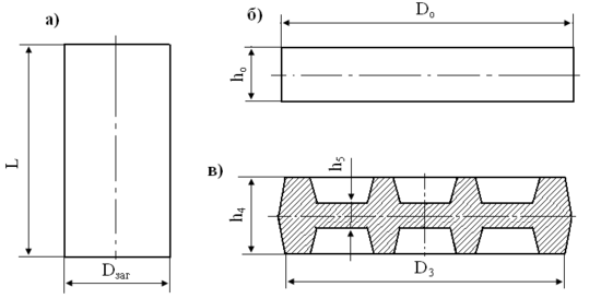 На рисунке 3 изображены: а) исходная заготовка; б) заготовка после осадки; в) отштампованная заготовка.
