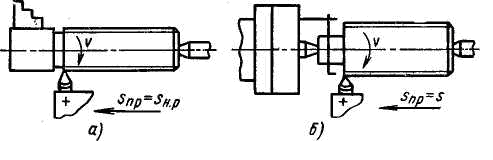 Нарезание резьбы на токарно-винторезных станках выполняют резцами, метчиками и плашками. Форма режущих кромок резцов определяется профилем и размерами поперечного сечения нарезаемых резьб. Резец устанавливают на станке по шаблону. Резьбу (рис. 5, а) нарезают с продольной подачей резца sпp. При нарезании резьбы продольный суппорт получает поступательное движение от ходового винта и раздвижной маточной гайки, смонтированной в фартуке станка. Это необходимо для того, чтобы резец получал равномерное поступательное движение, что обеспечивает постоянство шага нарезаемой резьбы.