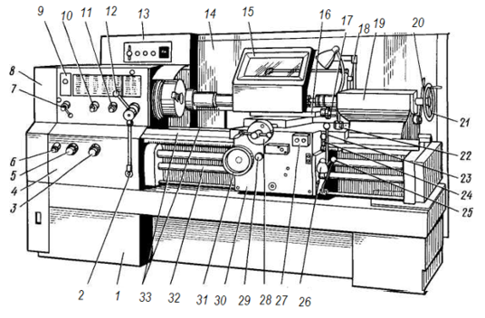 Рисунок. Токарно-винторезный станок 16К20. Общий вид и размещение органов управления: 1 – станина, рукоятки: 2 – сблокированная управления, 3, 5, 6 – установка подачи или шага нарезаемой резьбы, 7 , 12 – управления частотой вращения шпинделя, 10 – установки нормального и увеличенного шага резьбы и для нарезания многозаходных резьб, 11 – изменения направления нарезания резьбы (лево- и правозаходной), 17 – перемещения верхних салазок, 18 – фиксации пиноли, 20 – фиксации задней бабки, 23 - включения ускоренных перемещений суппорта, 24 – включения и выключения гайки ходового винта, 25 – управления изменением направления вращения шпинделя и его остановкой, 26 – включения и выключения подачи, 28 – поперечного перемещения салазок, 29 – включения продольной автоматической подачи, 31 – продольного перемещения салазок; 4 – коробка подач, 8 – кожух ременной передачи главного привода, 9 – передняя бабка с главным приводом, 13 – электрошкаф, 14 – экран, 15 – защитный щиток, 16 – верхние салазки, 19 – задняя бабка, 21 – штурвал перемещения пиноли, 22 – суппорт продольного перемещения, 27 – кнопка включения и выключения главного электродвигателя, 30 – фартук, 32 – ходовой винт, 33 – направляющие станины.