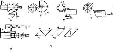 В серийном производстве для обработки фасонных поверхностей на токарных станках используют специальный гидрокопировальный суппорт вместо поперечного суппорта. Проходной резец имеет snp от продольного суппорта станка и srс от подвижной каретки гидросуппорта. Наклонную подачу суппорт получает от копира и следящего устройства гидросуппорта. Сумма sp движений обеспечивает движение резца по сложной траектории (рис. 4, е).