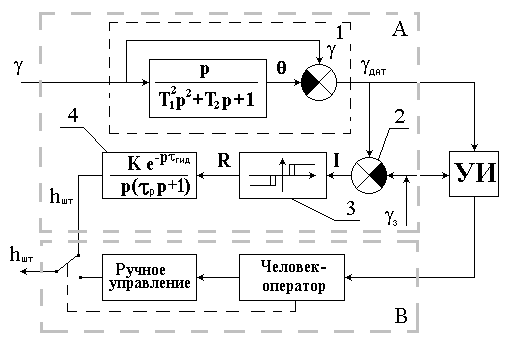 На схеме человек-оператор представлен в виде блока, выполняющего функции, близкие к безинерционному реле, так как в задачи данной работы не входит исследование особенностей человека как звена систем управления, этой проблеме посвящен ряд работ представленных в разд. 1.2.