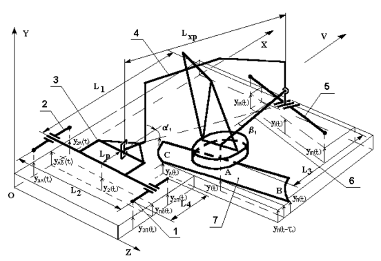 Решение поставленных в работе задач требует составления уравнений геометрических связей автогрейдера, рассмотрения перемещения РО в пространстве под действием различных факторов, определения динамических характеристик объекта при различных возмущающих и управляющих воздействиях.