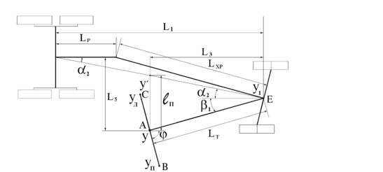 yПБ, yЛБ – условные вертикальные координаты правого и левого балансиров; y1 и y2 – условные вертикальные координаты центра передней и задней осей.