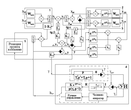 Поставленные в работе задачи требуют разработки обобщенной динамической структурной схемы автоматизированного автогрейдера. Разработанная структурная схема представлена на рис. 3.14, где 1 – блок, имитирующий передний мост автогрейдера; 2 и 3 – блоки, имитирующие соответственно правый и левый балансир; 4 – блок системы ССО; 5 – блок, имитирующий реакцию грунта при копании.