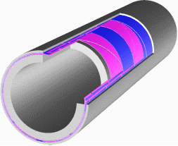 | Гибкие трубы были разработаны в начале 80-х годов для борьбы с коррозией трубопроводного транспорта. В основу гибких труб были заложены инженерные решения российских и французских специалистов-нефтяников, работавших в совместном Проекте по созданию шлангокабельного способа бурения глубоких скважин, с непрерывным процессом спуско-подъемных операций. Именно эти конструкции гибких бурильных труб, прошедшие в течение пяти лет суровую проверку при бурении экспериментальной глубокой скважины, и были заложены в основу конструкций труб для трубопроводного транспорта. Конструкция гибких труб, состоящая из слоев высокопрочной стали, перемежаемых полимерными оболочками, построена с дублированием функциональных свойств, что делает ее устойчивой по отношению к перепадам температур, динамике потока транспортируемой жидкости, подвижкам грунтов, транспортным и монтажным нагрузкам, и даже к механическим повреждениям. Гибкие трубы работают в нефтяных компаниях России: «ЮКОС», «ЛУКОЙЛ», «РОСНЕФТЬ», «СЛАВНЕФТЬ», «ТНК», «СИБНЕФТЬ» и др. Гибкие трубы работают на месторождениях 37 НГДУ 16 нефтегазодобывающих акционерных обществ, а также на 1 нефтяном терминале на побережье Северного Ледовитого Океана. Трубы работают практически во всех климатических регионах России и стран СНГ, при температуре окружающей среды от минус 60 до плюс 50 градусов Цельсия, в том числе: в Урало-Поволжье, в Западной Сибири, в Коми, на Сахалине, в Якутии, а также в республиках Казахстан и Азербайджан. Помимо нефтяной промышленности, гибкие трубы работают на предприятиях химической, нефтеперерабатывающей, геологии, угольной и других отраслях промышленности России. 2. ТРУБЫ ГИБКИЕ ПОЛИМЕРНО-МЕТАЛЛИЧЕСКИЕ Гибкие полимерно-металлические трубы (ГПМТ) предназначены для прокладки наземных и подземных трубопроводов при транспортировке нефти, нефтепродуктов, нефтегазовых смесей, воды с агрессивными примесями, а также для питьевого и хозяйственного водоснабжения. Назначение и область применения ГПМТ: