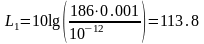 Звуковая мощность прессов составляет 0.001% от номинальной установочной мощности электродвигателя. Общая установленная мощность электродвигателей на участке, включая подъемно-траспортное оборудование и станочное оборудование, равняется 240 кВт. Площадь участка составляет 620 м2. Приведенный к единице коэффициент звукопоглощения равен 0.3. В этом случае: