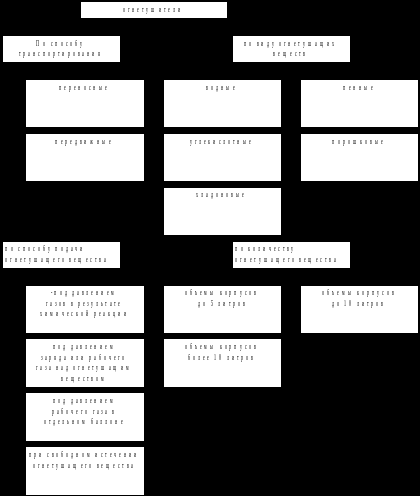 Воздушно-пенные огнетушители марок ОВП-5, ОВП-10, ОВП-100, ОВПУ-250.Зарядом в них является 6% водный раствор пенообразователя ПО-1. Давление в корпусе создается сжатым диоксидом углерода, находящемся в специальных баллонах, расположенных внутри (или снаружи) огнетушителя. Воздушно-механическая пена образуется в раструбе, где раствор, выходящий из корпуса, перемешивается с воздухом. Углекислотные огнетушители выпускают трех типов:ОУ-2А, ОУ-5, ОУ-8. Их применяют для тушения электроустановок под напряжением. СО2 в огнетушителе находится под давлением 6-8МПа. Для приведения в действие огнетушителя его раструб направляют на очаг горения и нажимают курок затвора, Время действия огнетушителя 25-40 секунд, длина струи 1,5-3 метров.