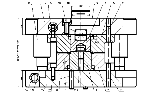Комбинированный штамп совмещенного действия для четвертой операции представлен на рис.3.4. На этой операции происходит обрезка детали по контуру на диаметр 110.4 мм, а также пробивка 8-ми отверстий диаметром 3 мм. Заготовка укладывается на пуансон-матрицу 4, фиксация и центрирование осуществляется с помощью фиксатора 5. При ходе ползуна пресса вниз, заготовка вначале зажимается между нижней матрицей 4и верхним прижимом 6, после чего происходит дальнейшее сближении половин штампа, пробивка отверстий с одновременной вырубкой по контуру. При ходе верхней половины штампа вверх, деталь выталкивается из матрицы выталкивателем 6 на поверхность штампа, отход в виде кольцевого ободка снимается с пуансона 4 съемником 21, а отход от пробивки отверстий удаляется на провал.
