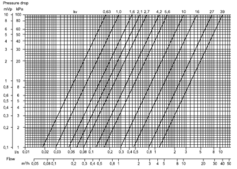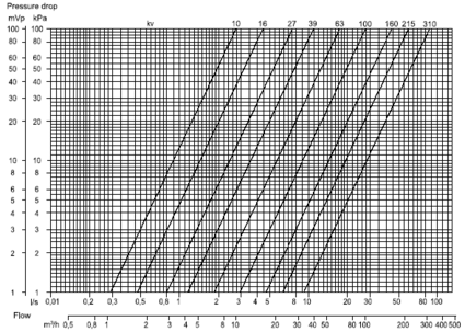 В качестве регулирующего органа на подаче теплоносителя применен трехходовой клапан типа NMTR производства фирмы Regin. Подбор клапана производится при условии перепада давления на нем не выше 20 кПа. Подбор производится по диаграмме, изображенной на рис.6.1.