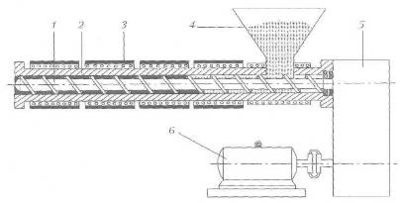 Рис. 1.1. Схематическое изображение экструдера: 1 – шнек; 2 – материальный цилиндр; 3 – нагреватели; 4 – загрузочный бункер; 5 – редуктор; 6 – двигатель