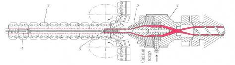 Рис. 1.6. Наружная калибровка гофрированной трубы с использованием сжатого воздуха и формовочных цепей: 1 – экструзионная головка; 2 – формующая щель; 3 – формовочная цепь; 4 – уплотнительная пробка; 5 – выход сжатого воздуха