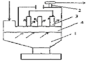 Рис. 3.1. Рукавный фильтр: 1 – корпус, 2 – выхлопная труба, 3 – фильтрующий рукав, 4 – затвор