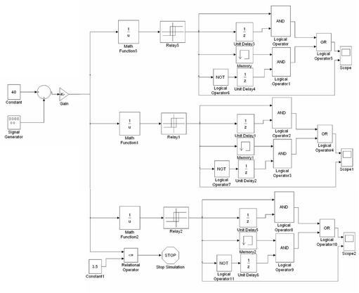 Создадим генератор имитирующий изменение давления масла в гидроаккумуляторе. Затем с помощью релейных элементов и функций вычислении обратной величины (как описано в предыдущем пункте) соберем компаратор, управляющий включением и отключением каждого насоса.