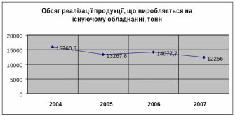 | Обсяг реалізації за існуючим обладнанням, тонн | 12256 | 10077,6 | 9913,9 | 9558,3 | 9401,2 |