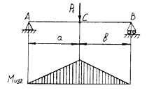 Под действием силы Р1, направляющая работает на изгиб. В точке С (АС=СВ) балка будет воспринимать максимальный изгибающий момент (Рис 2.3.)