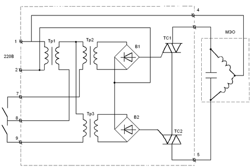Пускатель бесконтактный реверсивный типа ПБР-2 Предназначен для управления асинхронным однофазным конденсаторным электродвигателем, который используется в качестве приводов исполнительном механизме типа МЭО-63/25-0,63.