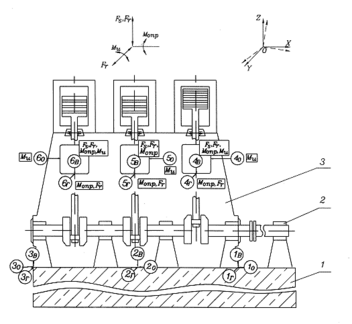 При этом в качестве обобщенных координат qj рассматривалось относительное движение деталей сопряжений в поле зазора и угол поворота колен вала. Зазоры учитывались в узлах "поршень-цилиндр", "башмак крейцкопфа-направляющая", а также в крейцкопфном и шатунном подшипниках скольжения. Введение в уравнения движения реактивной составляющей