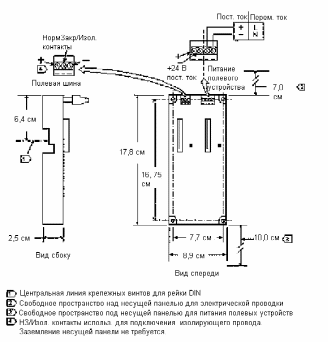 Несущая панель H1 стыкуется с сегментом полевой шины, как любое другое устройство полевой шины. Питание к несущей панели и установленным платам дискретного ввода-вывода подводится от дополнительного внешнего источника. Несущая панель крепится на рейке DIN (возможна установка только на T-рейку), стене или панели. На рисунке 5.4 указаны габаритные размеры несущей панели H1.