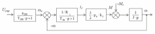 Электродвигатель представляется передаточными функциями электромагнитной и механической частей, представленных апериодическим и интегрирующим звеньями, соединенными последовательно.