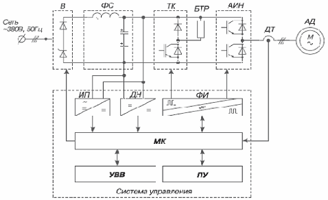 Для реализации режима динамического (реостатного) торможения в звено постоянного тока электропривода включён тормозной тиристорный (IGBT), ключ ТК и внешний блок тормозного резистора БТР. Датчики тока ДТ и напряжения ДН в силовом канале электропривода служат для контроля, регулирования и измерения электрических параметров электропривода, в т.ч. для защиты от токов перегрузки и короткого замыкания, недопустимых отклонений напряжения.