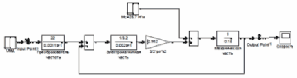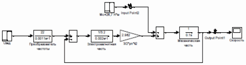 Исследование влияния возмущения – статической нагрузки на силовую часть системы ПЧ – АД осуществляется в соответствии со схемой, изображенной на рисунке 2.4.6. Отличие от схемы, изображенной на рисунке 2.4.3 состоит в местах расположения контрольных точек Input и Output .
